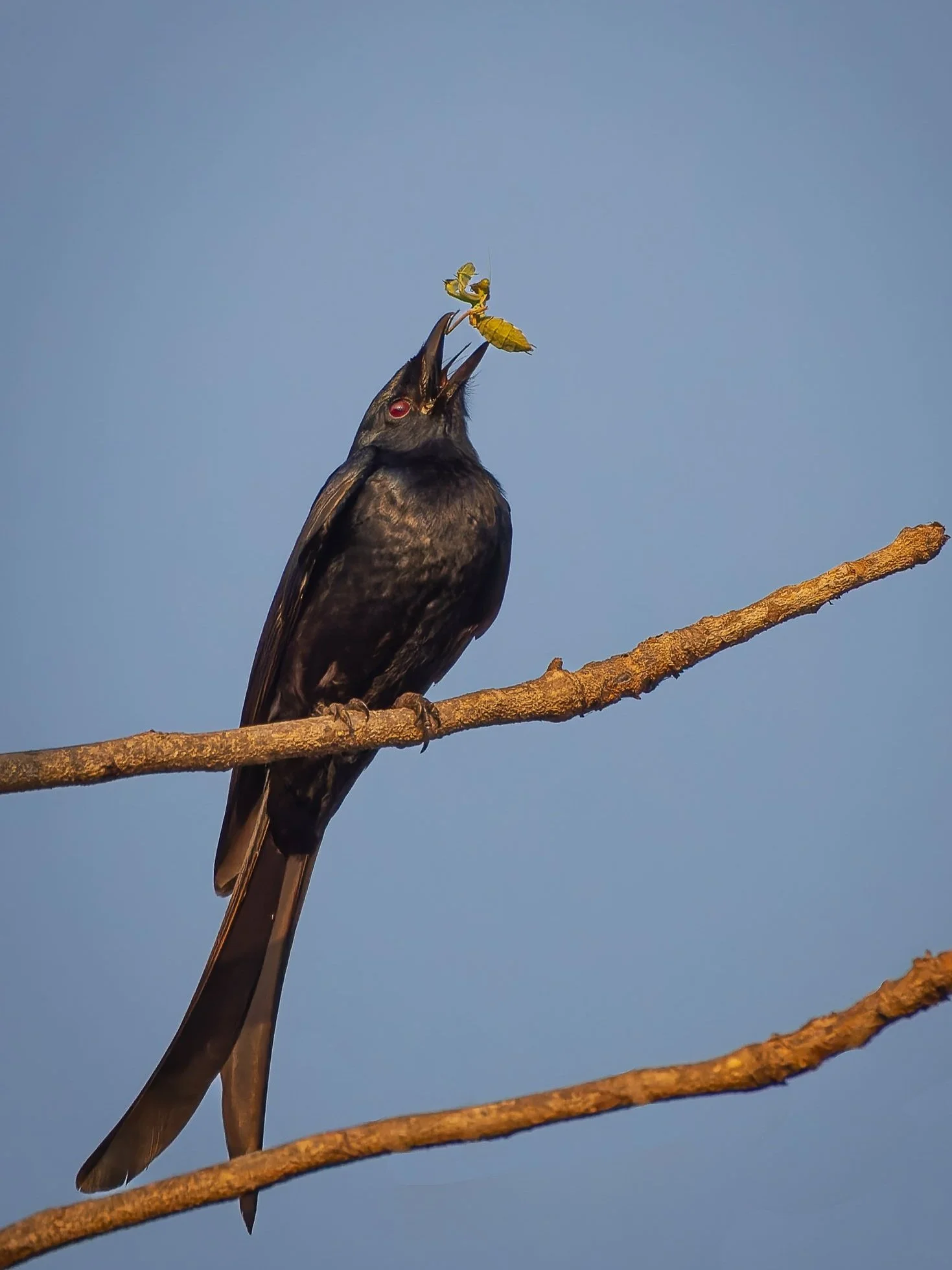 Black drongos are incredibly territorial, fearlessly mobbing threats like crows and raptors, especially during their breeding season (anytime from February to August).