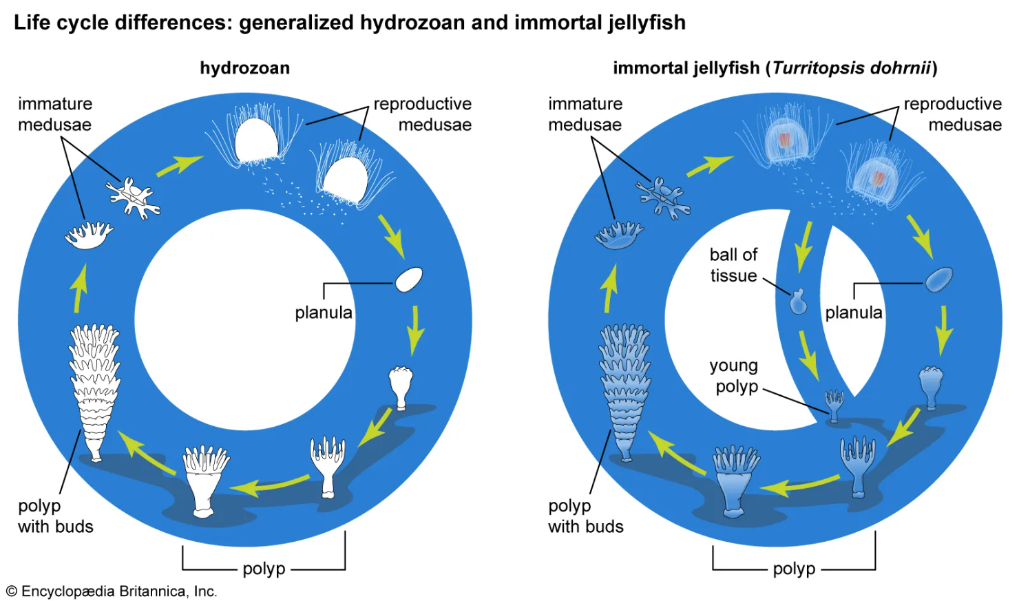 A jellyfish polyp and medusa are made up of different cell types, and, in most jellyfish, once they mature into a medusa, their cells no longer change. The immortal jellyfish can play this process in reverse. Through transdifferentiation, it transforms its mature medusa cells back into the cells of a polyp, forming a completely different body plan, effectively rewinding its life cycle.