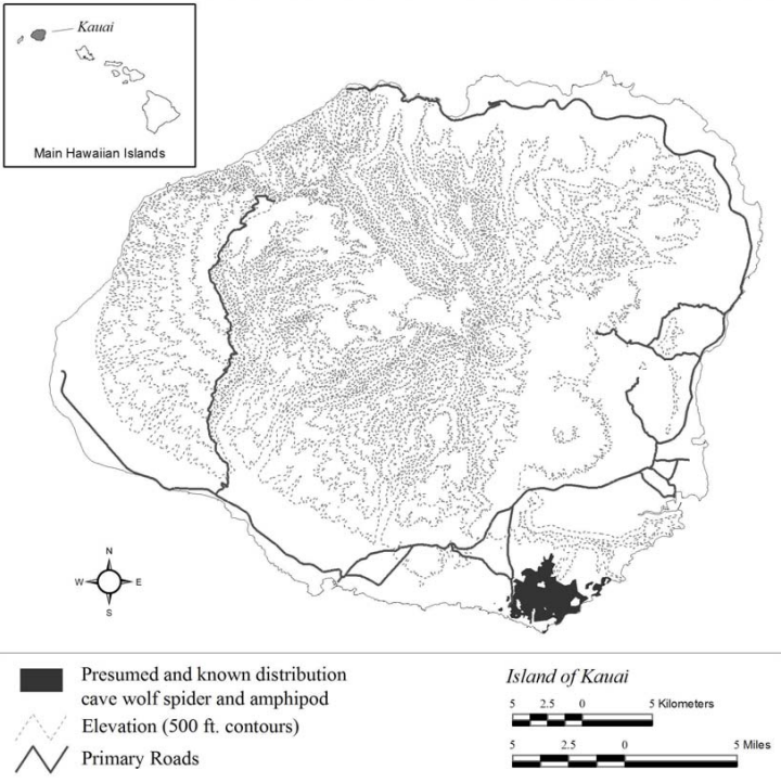 The Kauaʻi cave wolf spider is solely found on the Hawaiian island of Kauaʻi, and then only within a southern region known as the Koloa Basin, and, within the basin, has been regularly seen in just four caves.