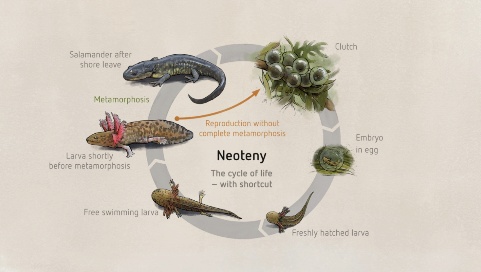 In 1993, a population of these salamanders was discovered in the dark and murky waters of an abandoned reservoir in Wisconsin — a habitat not unlike a deep, wet cave. The reservoir salamanders would have faced different conditions than they normally do on the surface; conditions both detrimental, such as a lack of food, and beneficial. Darwin noted his surprise that there aren’t more troglobites given the “less severe competition” in caves. That also extends to predators; the reservoir salamanders were no longer pursued by snakes, owls, and badgers. They also never metamorphosed. The reservoir population remained in their juvenile, aquatic states: lighter skin, a flattened tail and frilly gills. In other words, they become neotenic.
