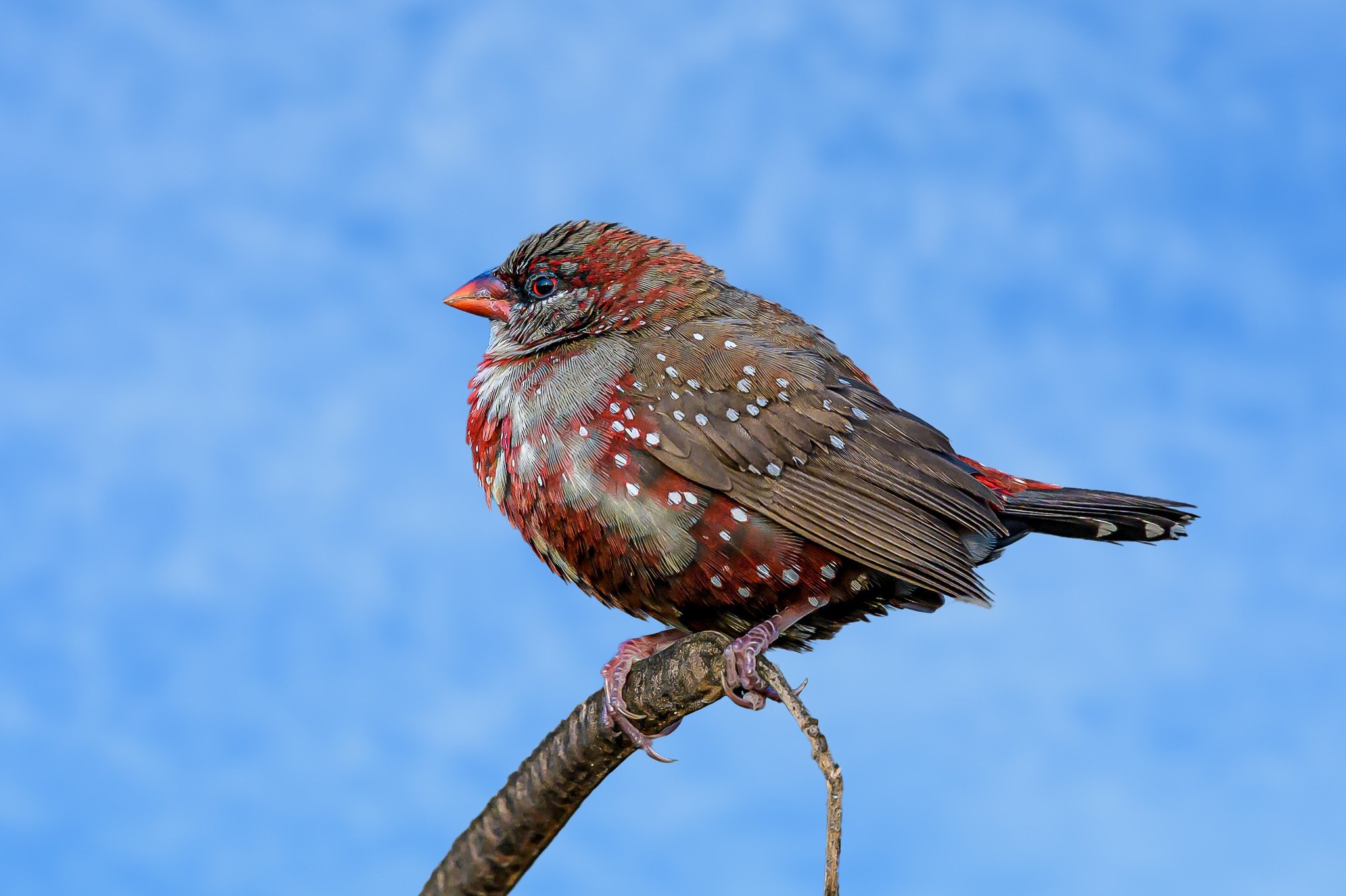 A male sits on the open branch of a bush, showing himself off. From beak tip to tail feathers, he is red. The dark feathering along his wings and tail only highlight his burning crimson colour. He peers around with a scarlet eye and opens his cherry-red beak to sing a high, chirping song. His feathers are decorated with white dots, as if bespeckled by a flick from an artist's brush. It's easy to see how such a bird, appearing like the brightest strawberry you’ve ever seen,² might catch the attention of a female.