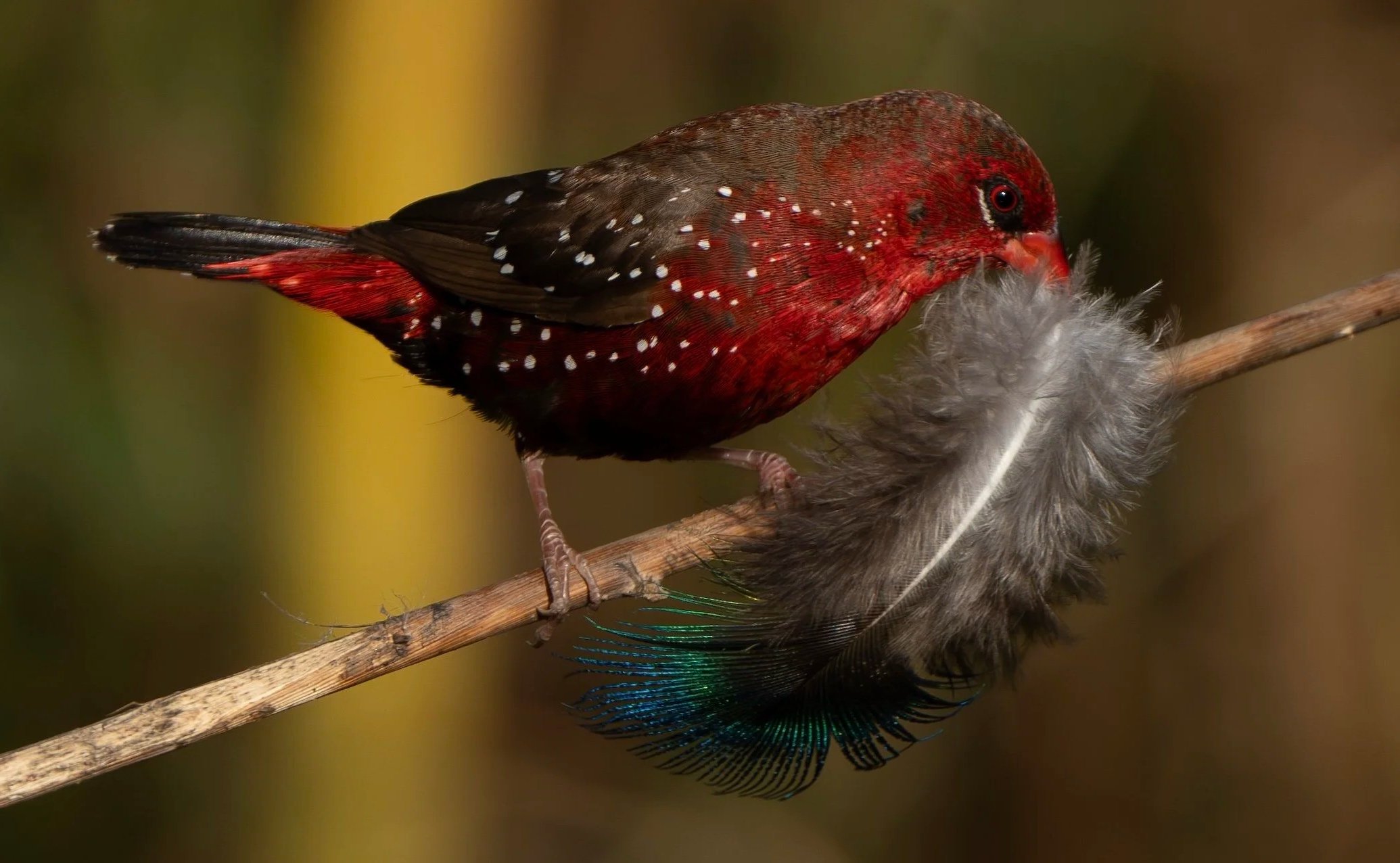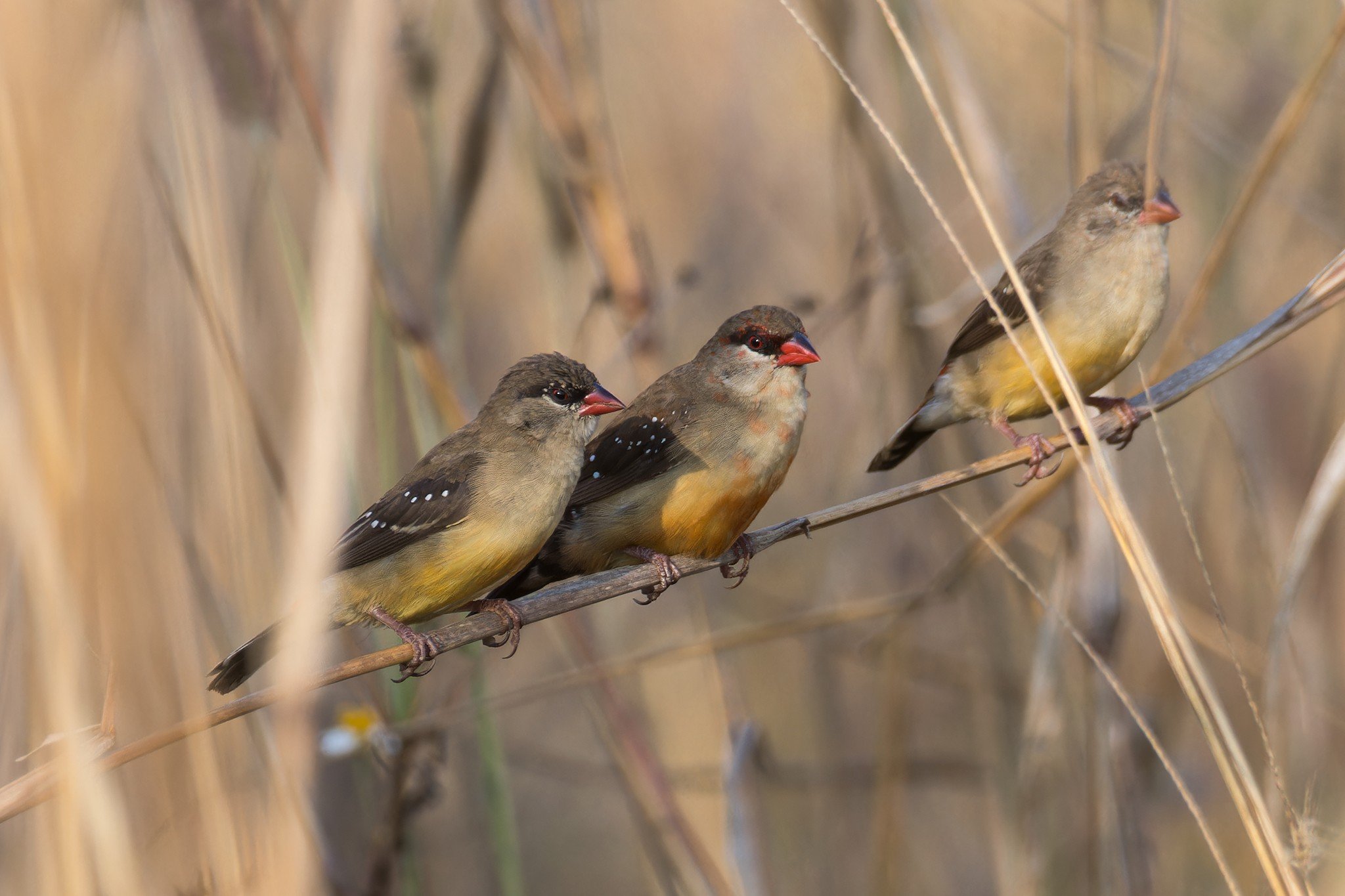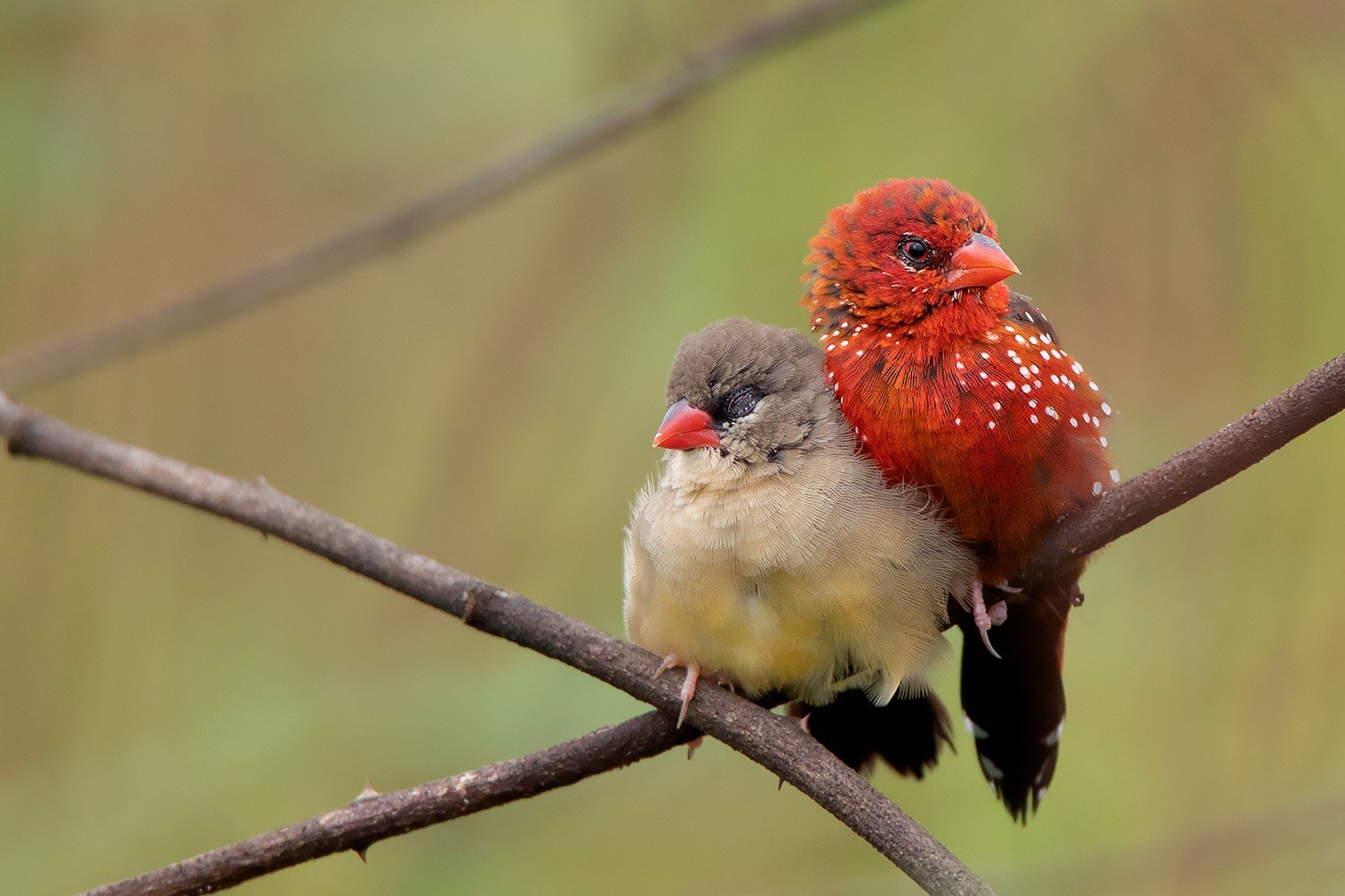 Outside of breeding season, when they aren’t in a race to reproduce, the not-so-red avadavats gather in large sociable flocks of up to 100 individuals. This gathering behaviour is called clumping. In their clumps, the avadavats flit about and preen one another.³ They sing shrill songs to warn each other of danger and call out merrily to their dull-coloured companions. They live in collective harmony until their next breeding season, when, like ripening strawberries, the males turn bright red once more.