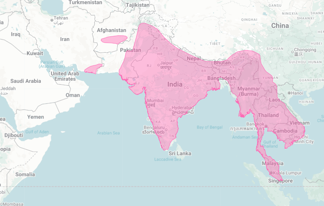 📍 Much of India, Pakistan, Nepal, Bangladesh, and Southeast Asia.